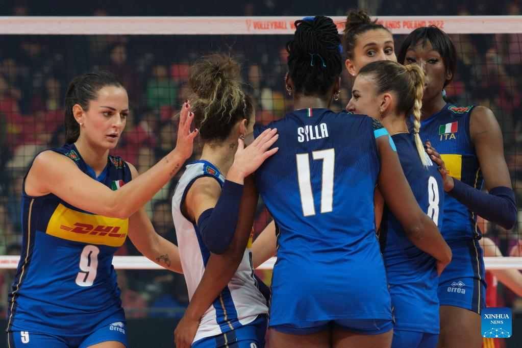 Players of Italy celebrate scoring during the quarterfinal match between China and Italy at the 2022 Volleyball Women's World Championship in Apeldoorn, the Netherlands, Oct. 11, 2022. (Xinhua/Meng Dingbo)