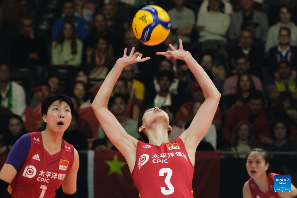 Diao Linyu (C) of China passes the ball during the quarterfinal match between China and Italy at the 2022 Volleyball Women's World Championship in Apeldoorn, the Netherlands, Oct. 11, 2022. (Xinhua/Meng Dingbo)