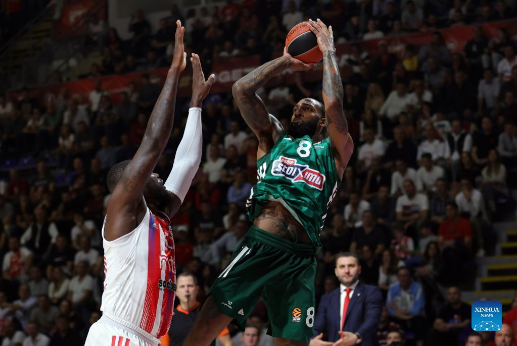 Panathinaiko's Derrick Williams (R) vies with Crvena Zvezda's Benjamin Bentil during the regular season round 2 Euroleague basketball match between Crvena Zvezda and Panathinaikos in Belgrade, Serbia, on Oct. 13, 2022. (Photo by Predrag Milosavljevic/Xinhua)