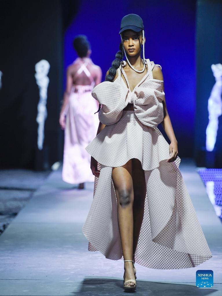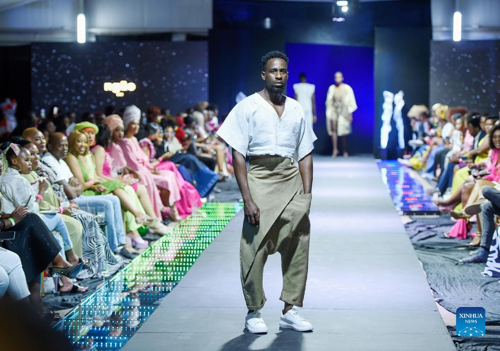 A model presents a creation during the 8th edition of Fashion Without Borders in Gaborone, capital of Botswana, Oct. 15, 2022. The 8th edition of Fashion Without Borders was held in Gaborone, Botswana, showcasing creations of 15 fashion designers from the Southern African Development Community (SADC) and celebrating the breast cancer awareness month with a touch of pink as a theme. (Photo by Tshekiso Tebalo/Xinhua)