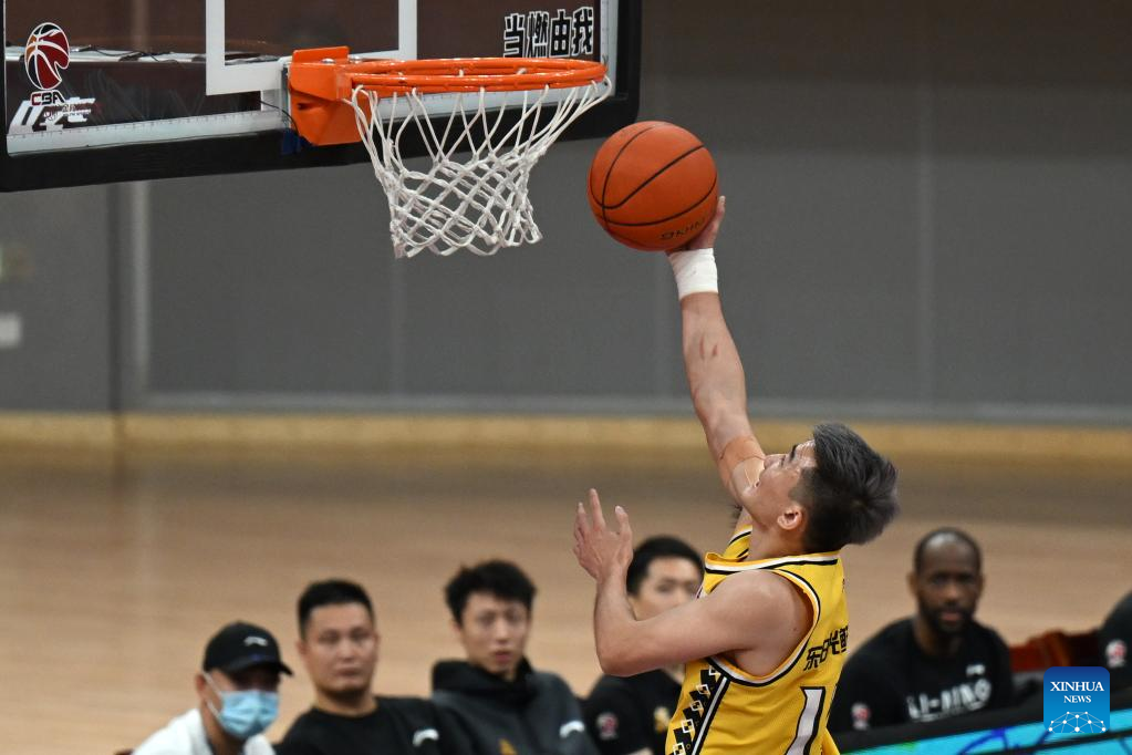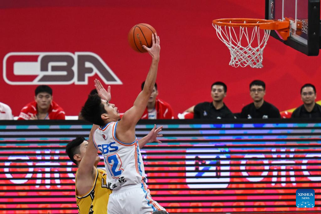 Chen Linjian (R) of Fujian Sturgeons goes for the basket during the 4th round match against Zhejiang Lions at the 2022-2023 season of the Chinese Basketball Association (CBA) league in Hangzhou, east China's Zhejiang Province, Oct. 17, 2022. (Xinhua/Chen Zhenhai)