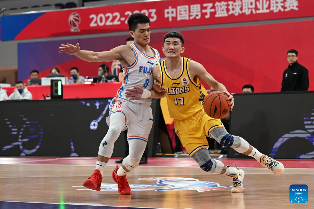 Zeng Lingxuan (R) of Fujian Sturgeons vies with Sun Minghui of Zhejiang Lions during the 4th round match at the 2022-2023 season of the Chinese Basketball Association (CBA) league in Hangzhou, east China's Zhejiang Province, Oct. 17, 2022. (Xinhua/Chen Zhenhai)