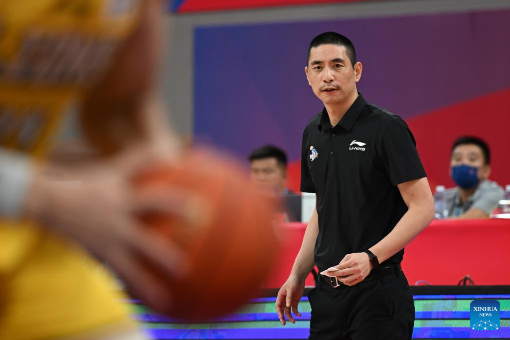 Zhu Shilong, coach of Fujian Sturgeons, reacts during the 4th round match against Zhejiang Lions at the 2022-2023 season of the Chinese Basketball Association (CBA) league in Hangzhou, east China's Zhejiang Province, Oct. 17, 2022. (Xinhua/Chen Zhenhai)