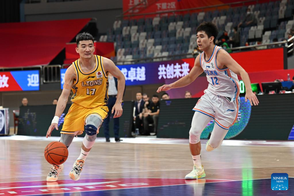 Li Yiyang (L) of Fujian Sturgeons vies with Sun Minghui of Zhejiang Lions during the 4th round match at the 2022-2023 season of the Chinese Basketball Association (CBA) league in Hangzhou, east China's Zhejiang Province, Oct. 17, 2022. (Xinhua/Chen Zhenhai)