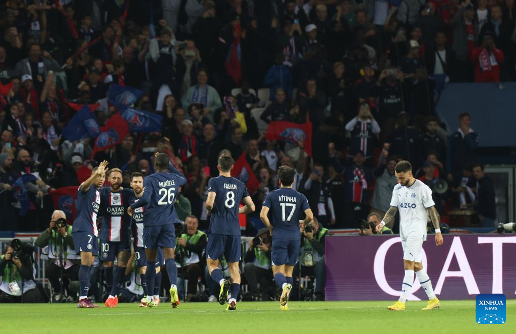 Players of Paris Saint-Germain celebrate their goal during the French League 1 football match between Paris-Saint Germain (PSG) and Olympique de Marseille (OM) at Parc de Prines in Paris, France , Oct. 16, 2022. (Xinhua/Gao Jing)