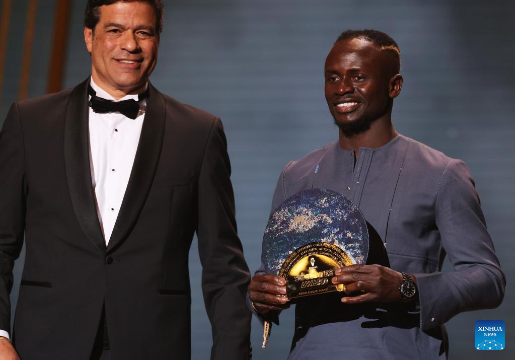 Bayern's Senegalese forward Sadio Mane (R) receives the Socrates Trophy for most involved player in societal and charitable projects from French-Brazilian former football player Rai during the 2022 Ballon d'Or France Football award ceremony at the Theatre du Chatelet in Paris, France, Oct. 17, 2022. (Xinhua/Gao Jing)