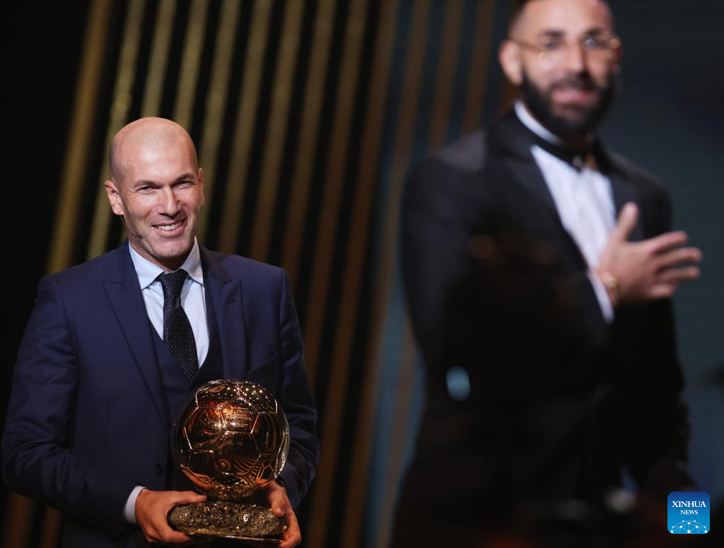 Zinedine Zidane (L) presents the men's Ballon d'Or Trophy to Real Madrid's French forward Karim Benzema during the 2022 Ballon d'Or France Football award ceremony at the Theatre du Chatelet in Paris, France, Oct. 17, 2022. (Xinhua/Gao Jing)