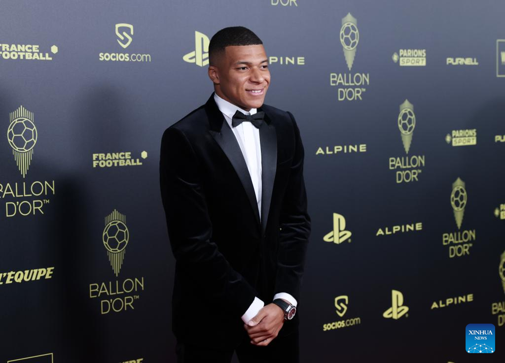 Paris Saint-Germain's French forward Kylian Mbappe poses upon arrival to attend the 2022 Ballon d'Or France Football award ceremony at the Theatre du Chatelet in Paris, France, Oct. 17, 2022. (Xinhua/Gao Jing)