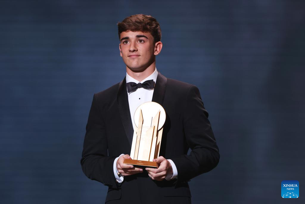 Barcelona's Spanish midfielder Gavi poses with the Kopa Trophy for best under-21 player during the 2022 Ballon d'Or France Football award ceremony at the Theatre du Chatelet in Paris, France, Oct. 17, 2022. (Xinhua/Gao Jing)