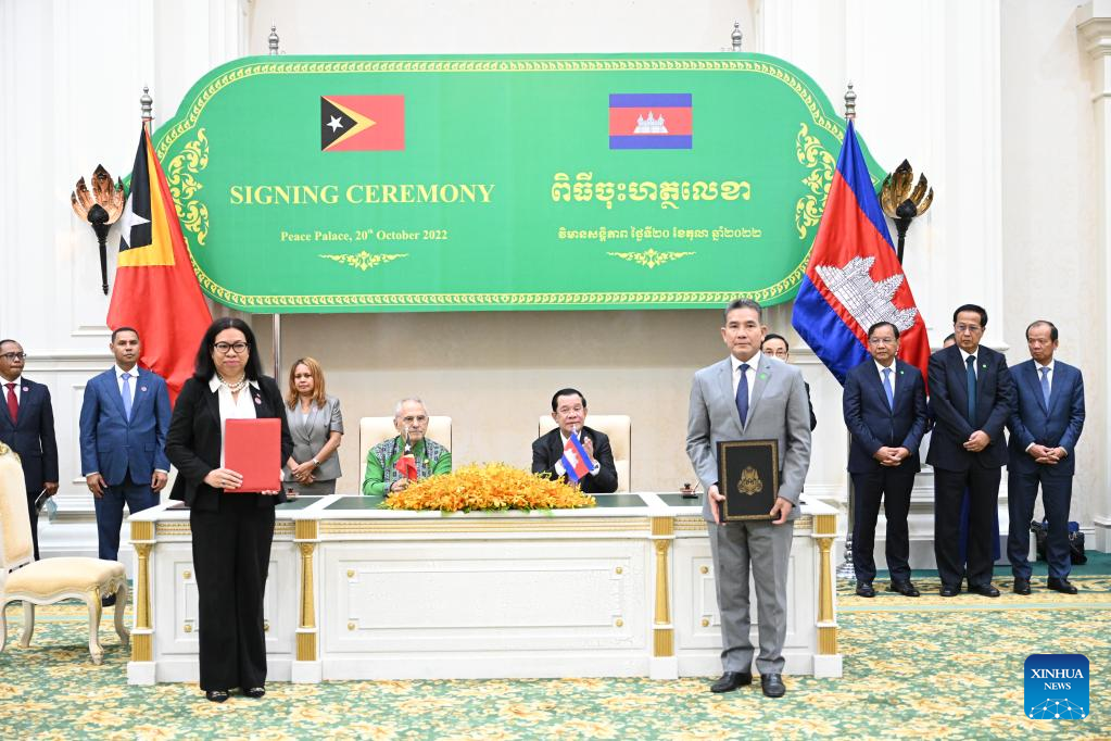 PHNOM PENH, Oct. 20 (Xinhua) -- Cambodia and Timor-Leste on Thursday signed two deals to boost bilateral ties and cooperation, a Cambodian senior official said.
