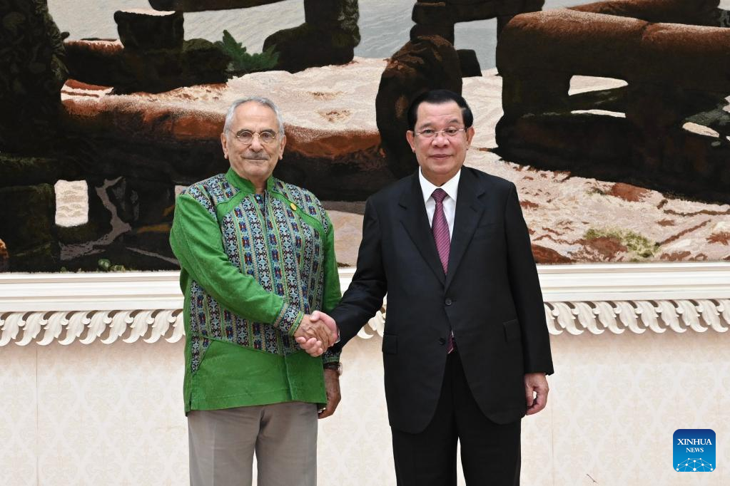 Cambodian Prime Minister Samdech Techo Hun Sen (R) shakes hands with visiting Timor-Leste's President Jose Ramos-Horta in Phnom Penh, Cambodia, Oct. 20, 2022. (Photo by Ly Lay/Xinhua)