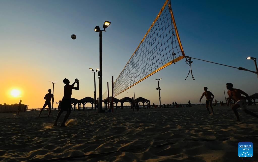 People play on the beach at sunset in the central Israeli city of Tel Aviv, Oct. 22, 2022. (Photo by Muammar Awad/Xinhua)