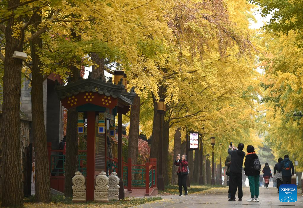 People enjoy the autumn scenery at the Yuanmingyuan Park, or the Old Summer Palace, in Beijing, capital of China, Oct. 26, 2022. (Xinhua/Luo Xiaoguang)