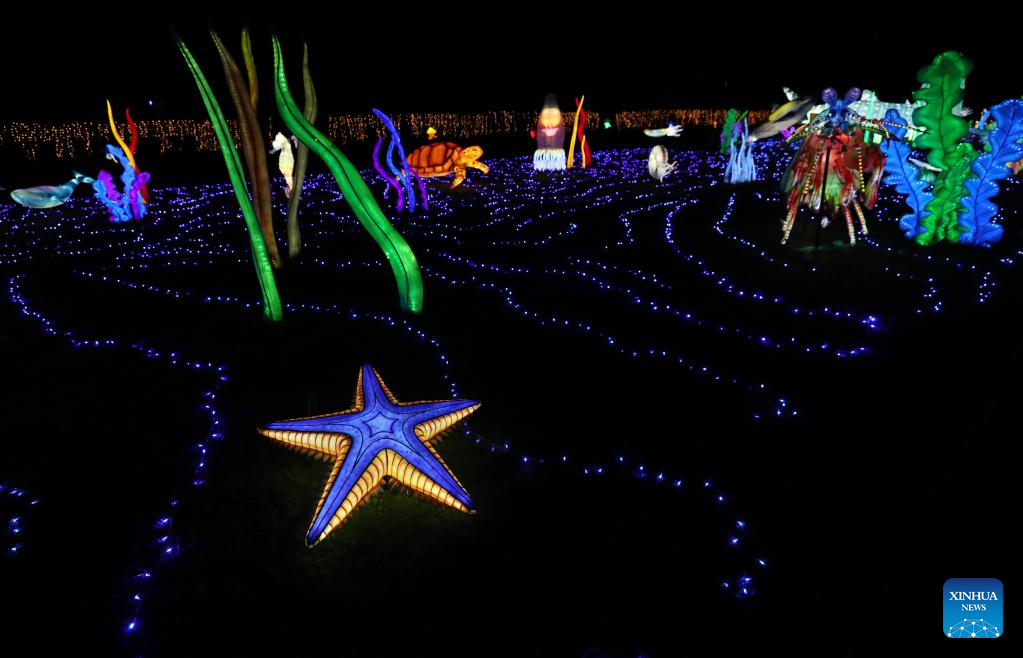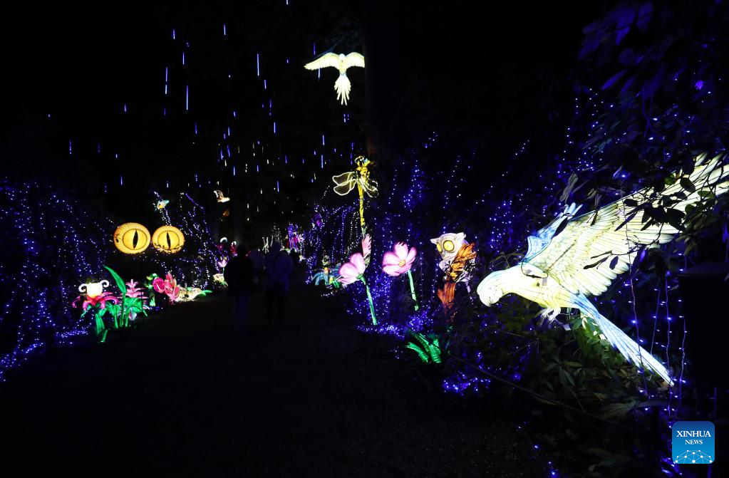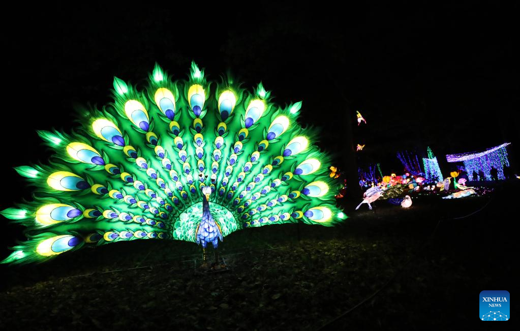 Illuminated sculptures are pictured during a media tour of a light festival at Thoiry zoo near Paris, France, Oct. 26, 2022. The festival will kick off here on Sunday, displaying around 2,000 illuminated sculptures. (Xinhua/Gao Jing)