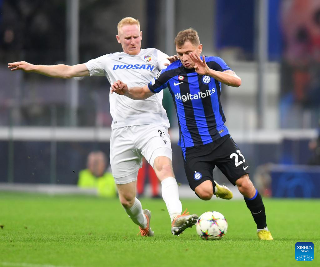 FC Inter's Nicolo Barella (R) vies with Viktoria Plzen's Vaclav Jemelka during the UEFA Champions League Group C match between FC Inter and FC Viktoria Plzen in Milan, Italy, on Oct. 26, 2022. (Str/Xinhua)