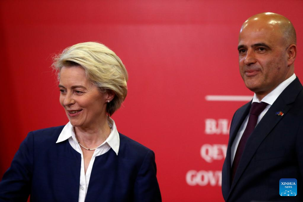 President of the European Commission Ursula von der Leyen (L) speaks during a joint press conference with North Macedonia's Prime Minister Dimitar Kovachevski in Skopje, North Macedonia, Oct. 26, 2022. The European Union (EU) will provide 500 million euros (504 million U.S. dollars) in grants for the Western Balkan countries to tackle energy crisis, European Commission chief said here Wednesday. (Photo by Tomislav Georgiev/Xinhua)
