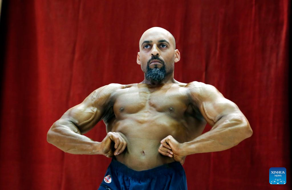 An athlete competes in a bodybuilding game in Sanaa, Yemen's capital, on Oct. 20, 2022. (Photo by Mohammed Mohammed/Xinhua)