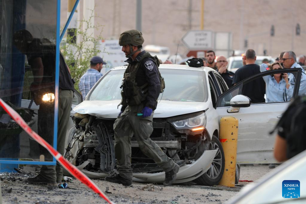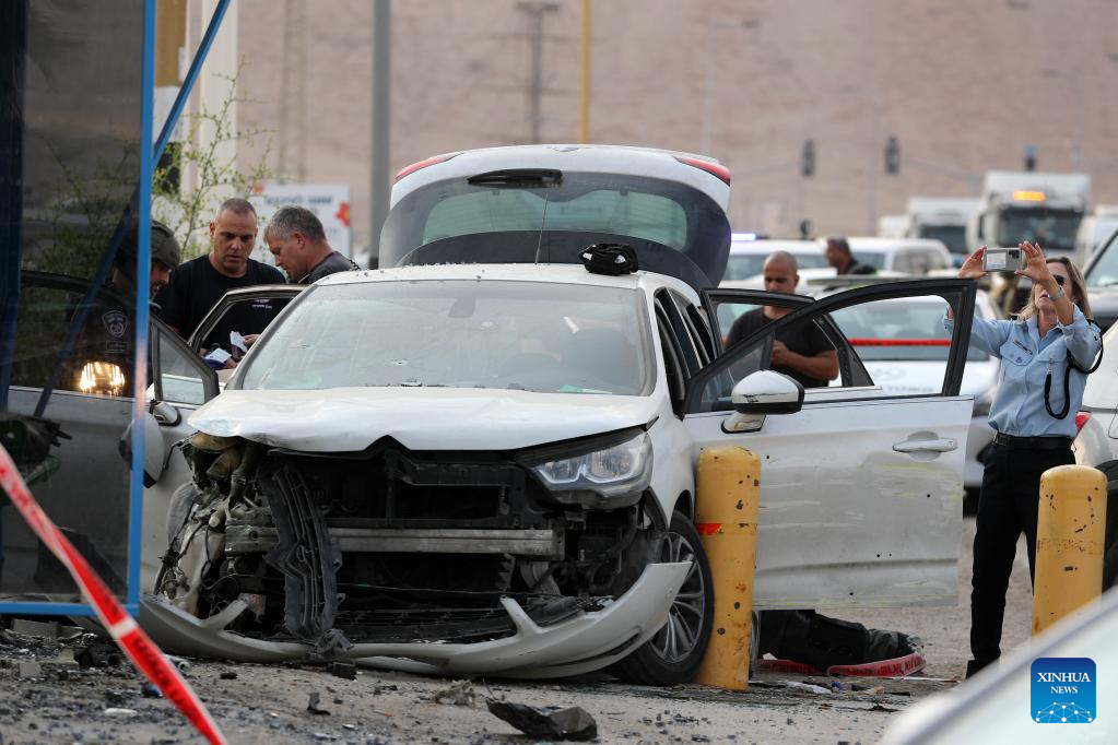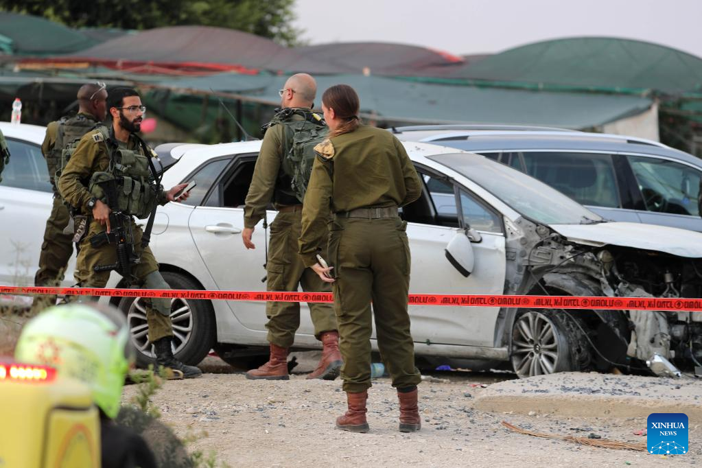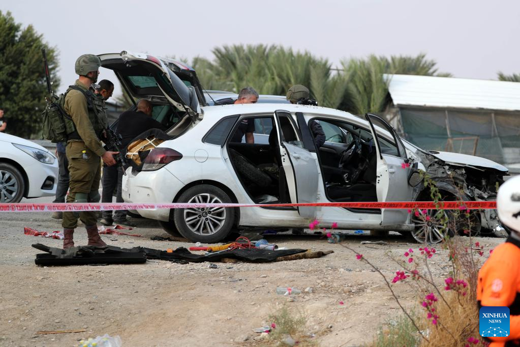 Israeli security forces work at the scene of a car-ramming attack at the Almog Junction near the West Bank city of Jericho, on Oct. 30, 2022. The Palestinian who carried out a car-ramming attack on Sunday south of the West Bank city of Jericho died of his wounds in hospital after being shot by Israeli soldiers, the Palestinian health ministry and security sources said. Barakat Oudeh, 49, from the neighborhood of Al-Eizariya, east of Jerusalem, drove near a crossroad south of Jericho, hitting and wounding at least seven Israeli soldiers, before Israeli servismen opened fire and critically injured him, they added. (Photo by Muammar Awad/Xinhua)