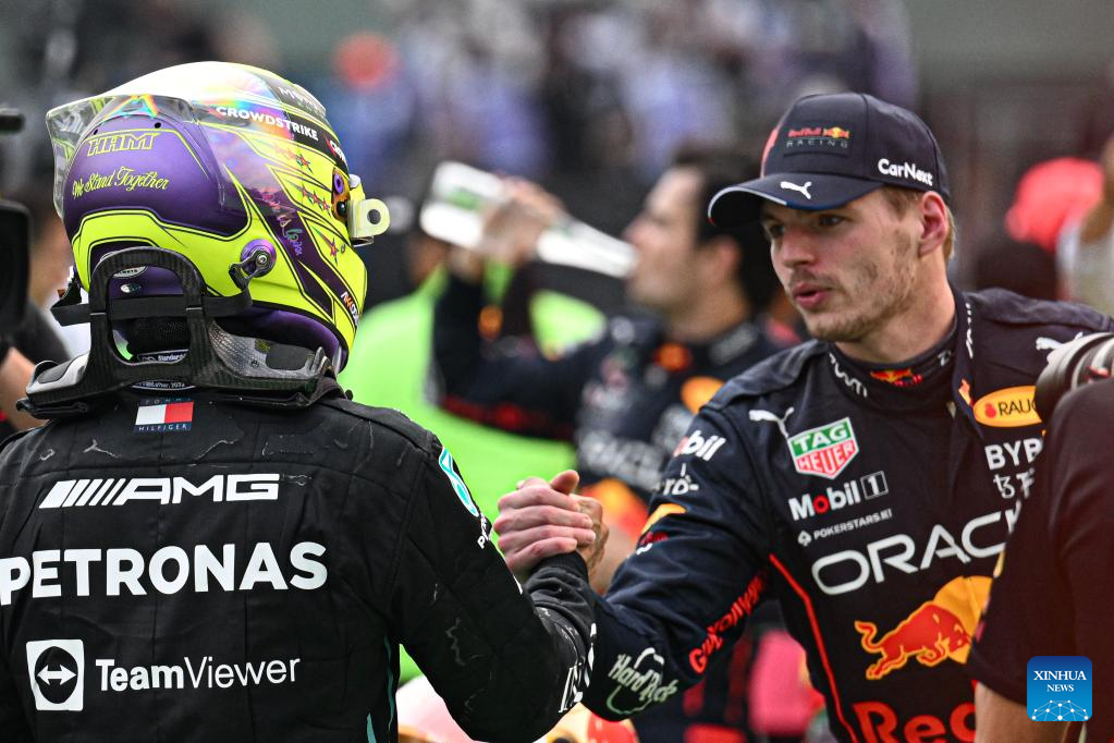 Red Bull's Dutch driver Max Verstappen (R) and Mercedes' British driver Lewis Hamilton shake hands after the 2022 Formula One Mexico Grand Prix at the Hermanos Rodriguez Circuit in Mexico City, Mexico, on Oct. 30, 2022. (Xinhua/Xin Yuewei)