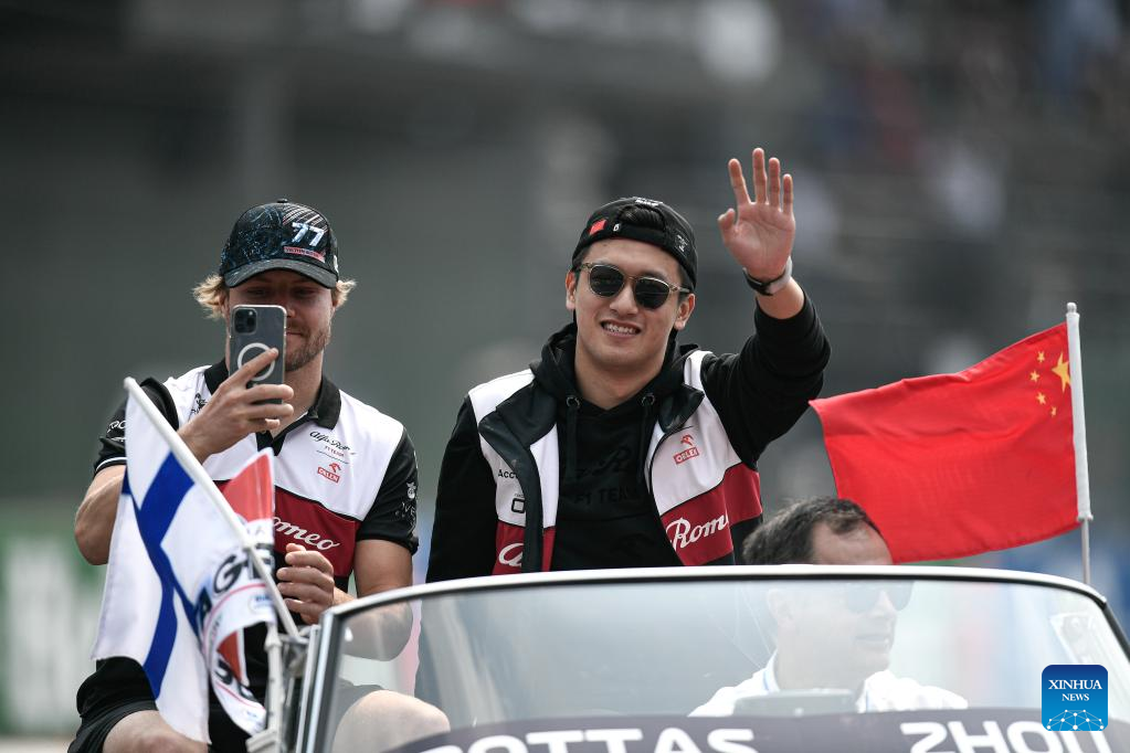 Alfa Romeo's Chinese driver Zhou Guanyu (R) and Finnish driver Valtteri Bottas are seen during the drivers' parade before the final race of the 2022 Formula One Mexico Grand Prix at the Hermanos Rodriguez Circuit in Mexico City, Mexico, on Oct. 30, 2022. (Xinhua/Xin Yuewei)