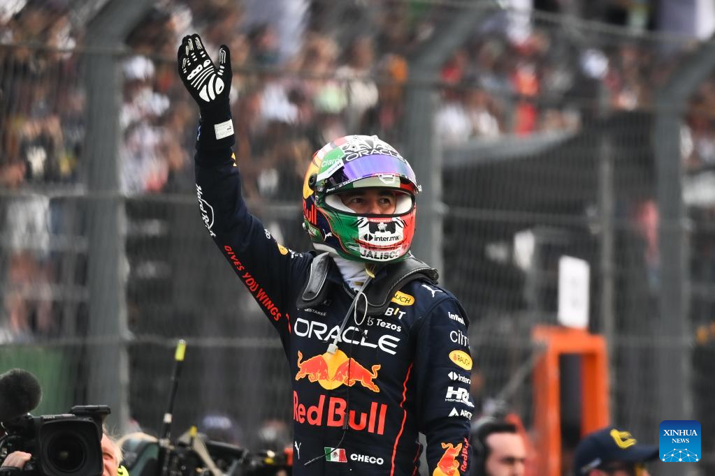 Red Bull's Mexican driver Sergio Perez reacts after the 2022 Formula One Mexico Grand Prix at the Hermanos Rodriguez Circuit in Mexico City, Mexico, on Oct. 30, 2022. (Xinhua/Xin Yuewei)
