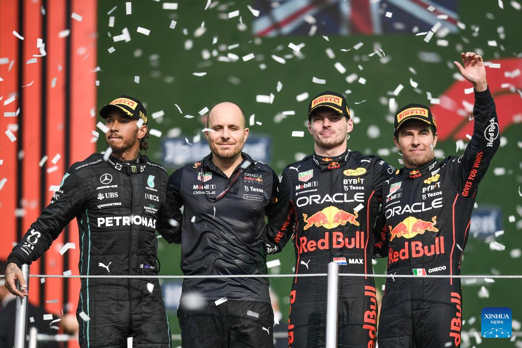 Red Bull's Max Verstappen (C) of the Netherlands, Mercedes' Lewis Hamilton (L) of Britain and Red Bull's Sergio Perez of Mexico are seen on the podium during the awarding ceremony of the 2022 Formula One Mexico Grand Prix at the Hermanos Rodriguez Circuit in Mexico City, Mexico, on Oct. 30, 2022. (Xinhua/Xin Yuewei)