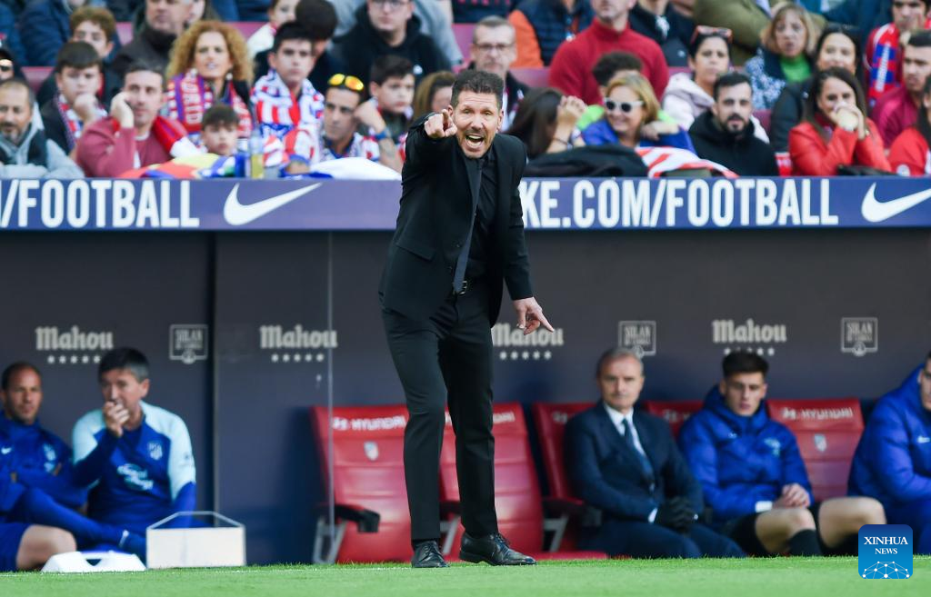 Head coach of Atletico de Madrid Diego Simone gestures during a Spanish La Liga football match between Atletico de Madrid and RCD Espanyol in Madrid, Spain, Nov. 6, 2022. (Photo by Gustavo Valiente/Xinhua)