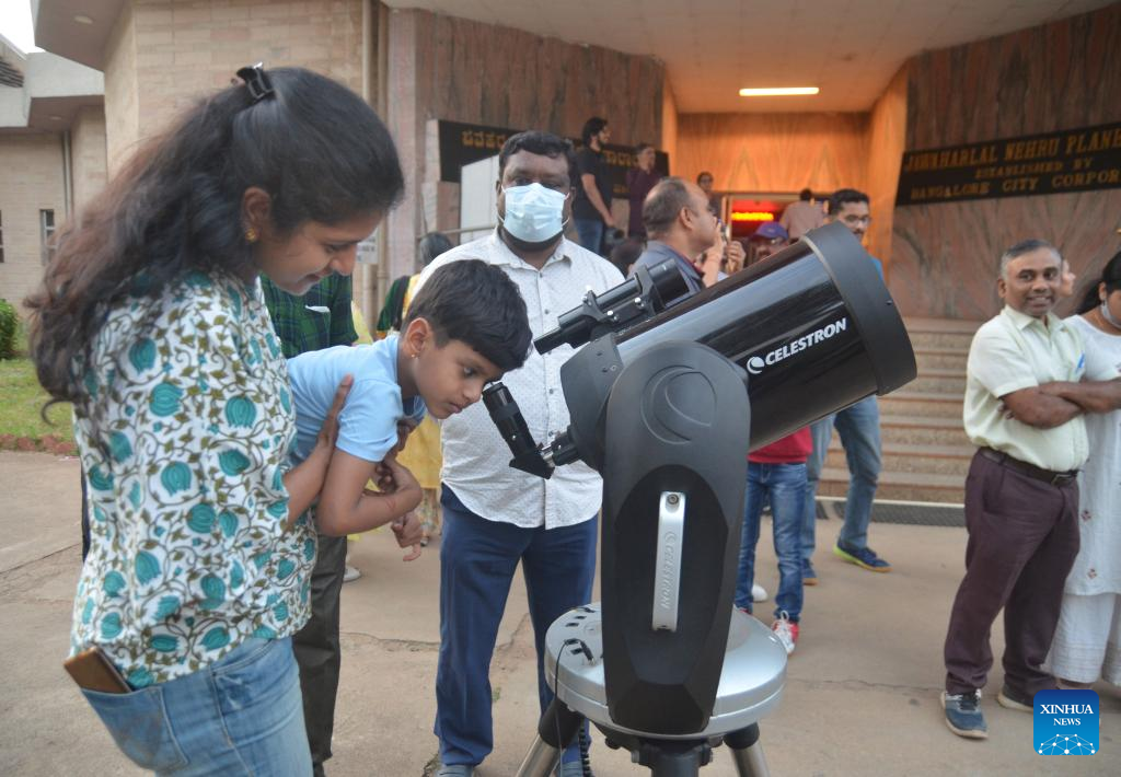 People watch the moon through a telescope during a lunar eclipse in Bangalore, India, Nov. 8, 2022. (Str/Xinhua)