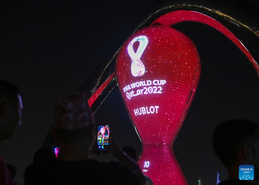 A countdown clock shows 10 days left to the opening of the Qatar 2022 FIFA World Cup in Doha, Qatar, Nov. 10, 2022. (Photo by Nikku/Xinhua)