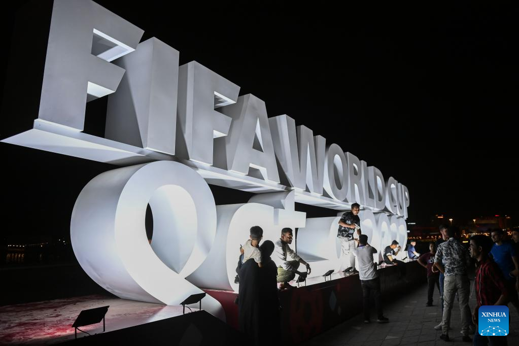 People take photos in front of a FIFA World Cup Qatar 2022 decoration at Doha Corniche in Doha, Qatar, Nov. 10, 2022. (Photo by Nikku/Xinhua)