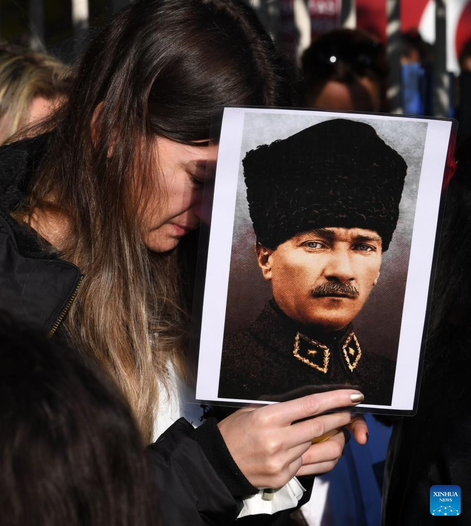 A woman commemorates the 84th death anniversary of Mustafa Kemal Ataturk in Istanbul, Türkiye, Nov. 10, 2022. Türkiye mourned on Thursday the 84th death anniversary of Mustafa Kemal Ataturk, founder of the Republic of Türkiye. (Xinhua/Shadati)