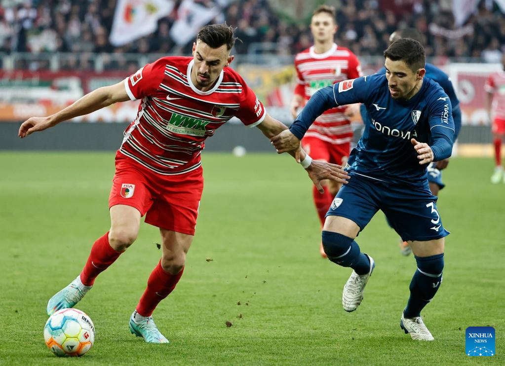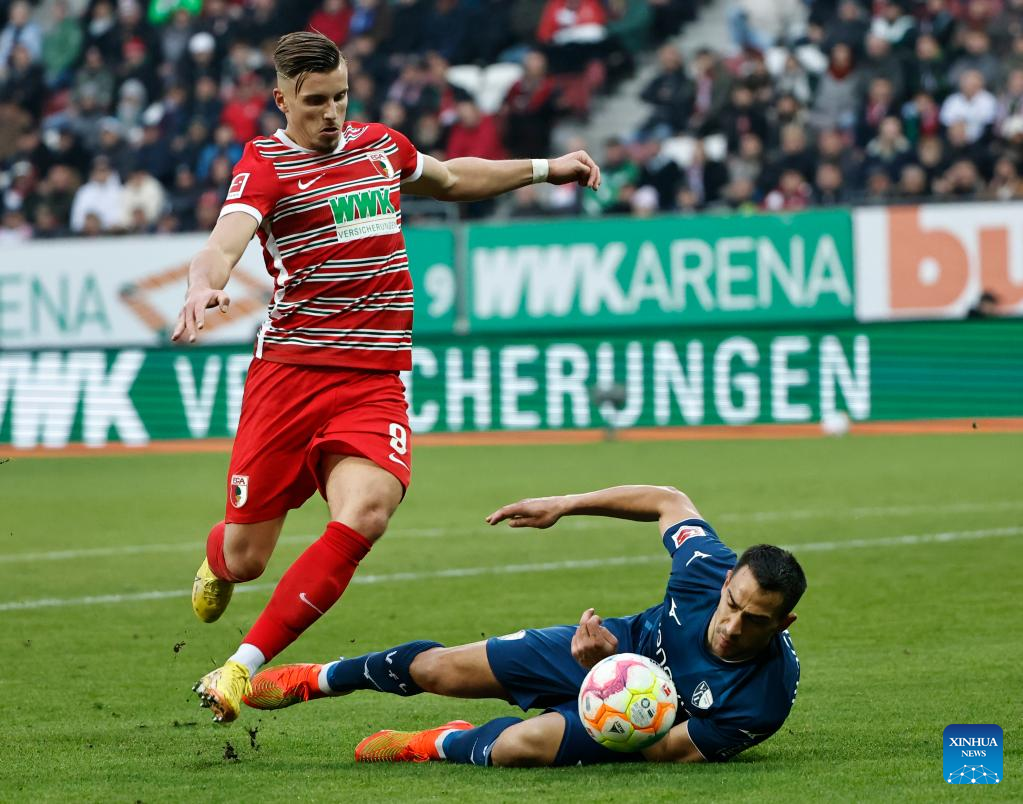 Ruben Vargas (L) of Augsburg vies with Kevin Stoger of Bochum during the German first division Bundesliga football match between FC Augsburg and VfL Bochum 1848 in Augsburg, Germany, Nov. 12, 2022. (Photo by Philippe Ruiz/Xinhua)