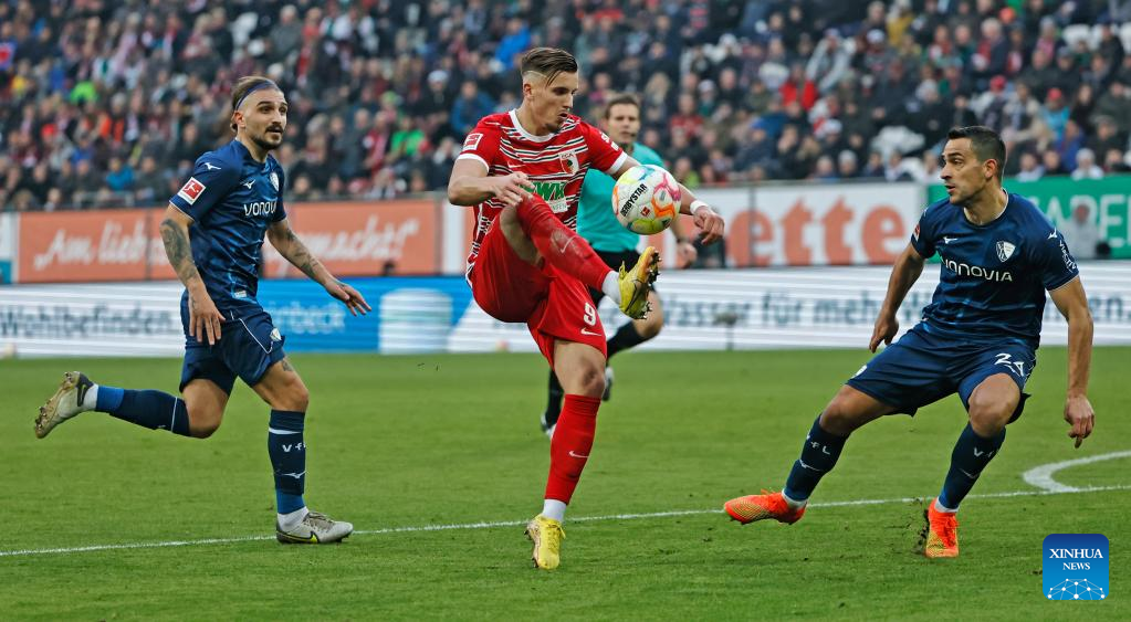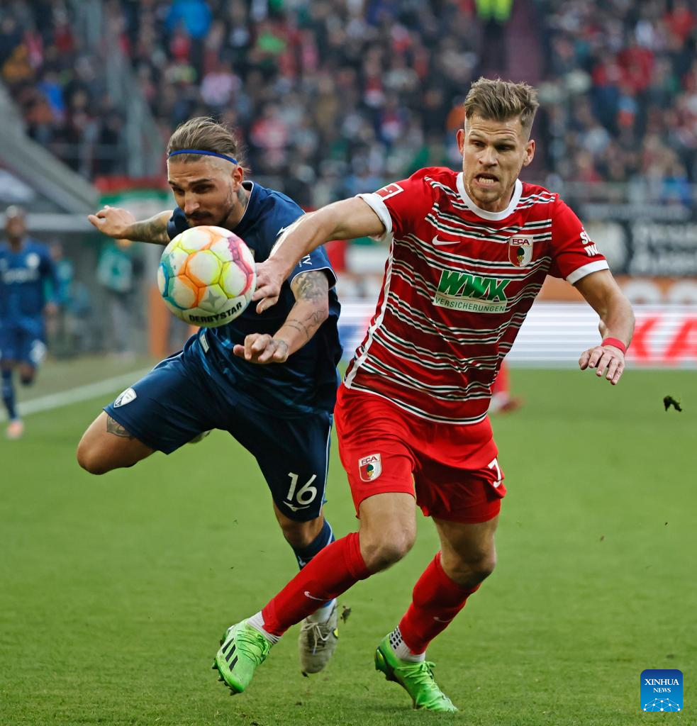 Ermedin Demirovic (C) of Augsburg stops the ball during the German first division Bundesliga football match between FC Augsburg and VfL Bochum 1848 in Augsburg, Germany, Nov. 12, 2022. (Photo by Philippe Ruiz/Xinhua)