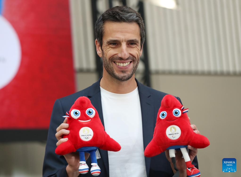 Tony Estanguet, President of Paris 2024, poses with the Phryges, unveiled as the official mascots of Paris 2024 Olympic and Paralympic Games during a press conference in Saint Denis, France, Nov. 14, 2022. (Xinhua/Gao Jing)