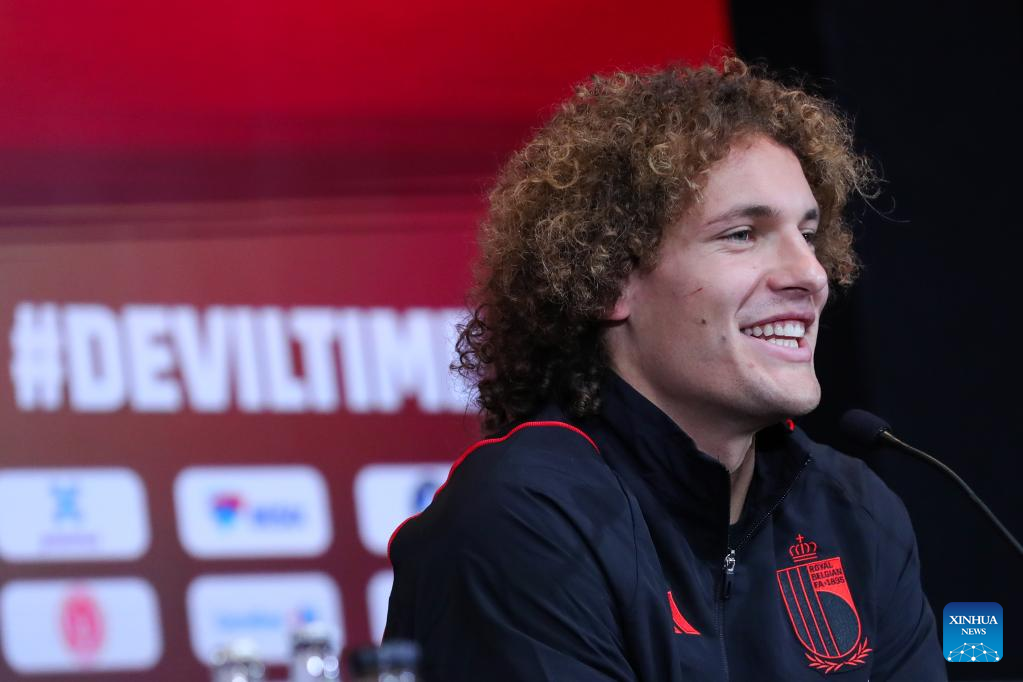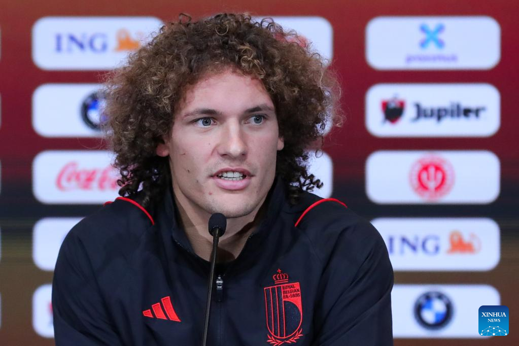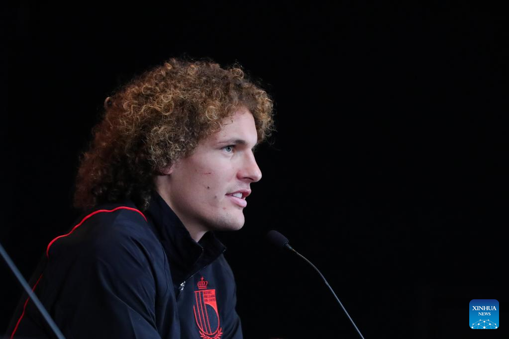 Belgium's national football team player Wout Faes speaks during a press conference in Tubize, Belgium, Nov. 14, 2022, ahead of the upcoming FIFA football World Cup 2022 in Qatar. (Xinhua/Zheng Huansong)