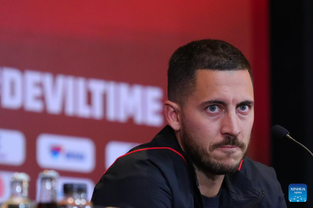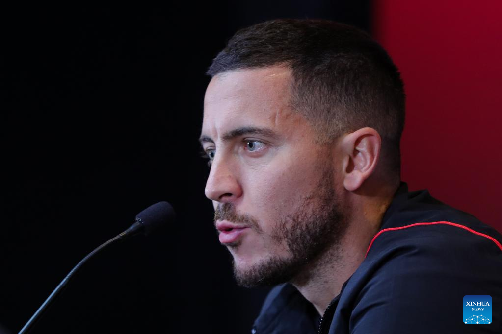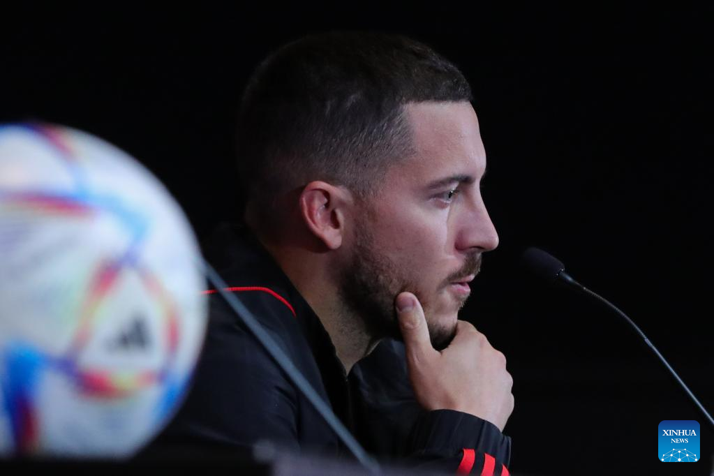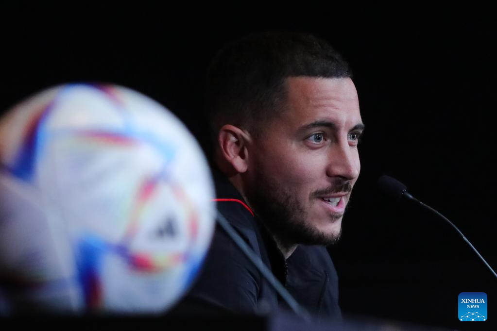 Belgium's national football team player Eden Hazard speaks during a press conference in Tubize, Belgium, Nov. 14, 2022, ahead of the upcoming FIFA football World Cup 2022 in Qatar. (Xinhua/Zheng Huansong)