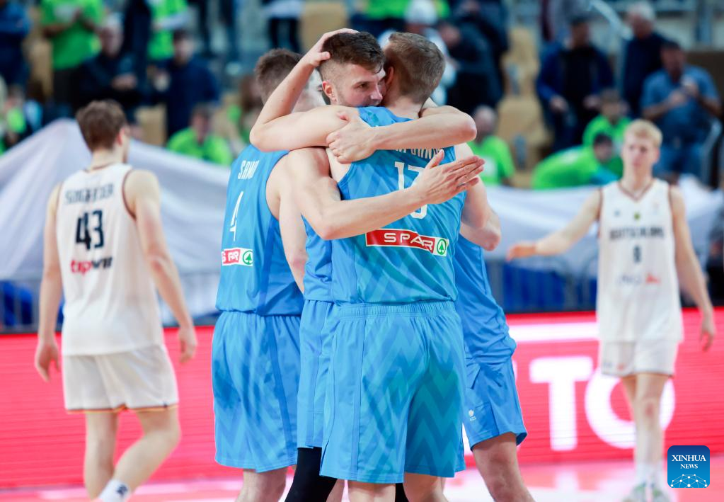 Players of Slovenia celebrate victory after the FIBA Basketball World Cup 2023 European Qualifiers group J round 2 match against Germany in Koper, Slovenia, Nov. 14, 2022. (Photo by Zeljko Stevanic/Xinhua)