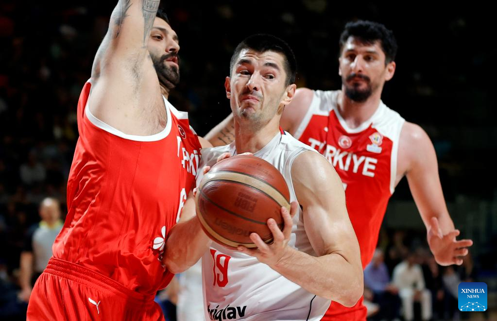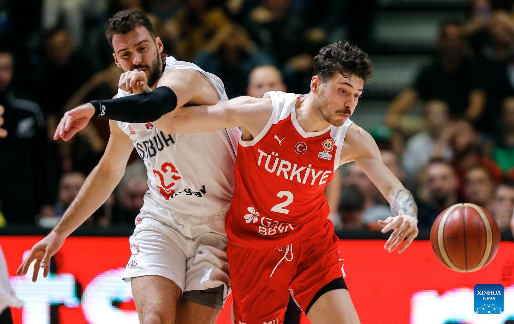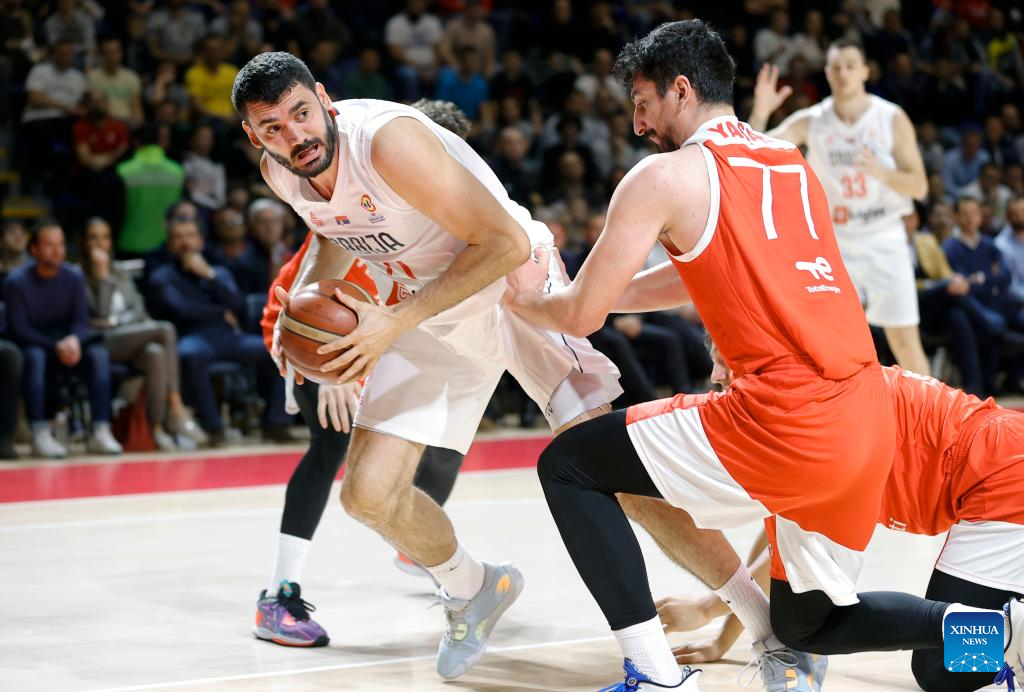 Sehmus Hazer (R) of Türkiye vies with Marko Guduric of Serbia during their FIBA Basketball World Cup 2023 European qualifiers group I round 2 match in Belgrade, Serbia, on Nov. 14, 2022. (Photo by Predrag Milosavljevic/Xinhua)