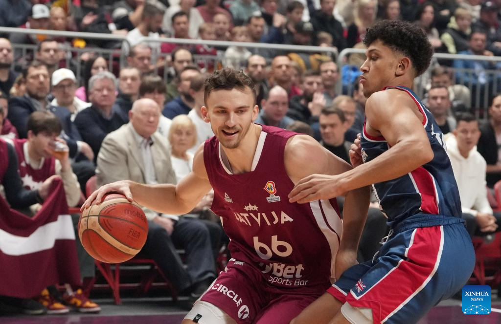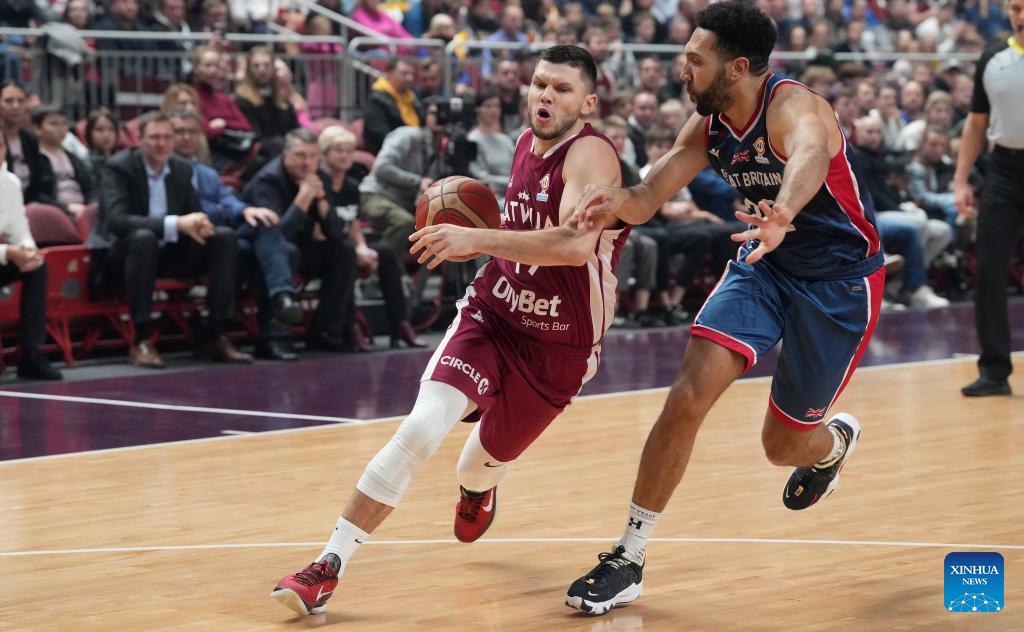 Janis Strelnieks (R) Latvia breaks through during the FIBA Basketball World Cup 2023 European qualifiers group I round 2 match between Latvia and Great Britain in Riga, Latvia, Nov. 14, 2022. (Photo by Edijs Palens/Xinhua)