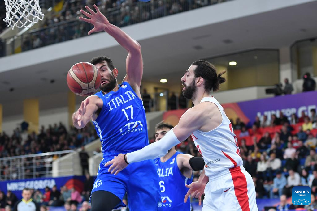 Thaddus McFadden (Front R) of Georgia vies with Alessandro Pajola of Italy during their FIBA Basketball World Cup 2023 European qualifiers group L round 2 match in Tbilisi, Georgia, Nov. 14, 2022. (Photo by Tamuna Kulumbegashvili/Xinhua)