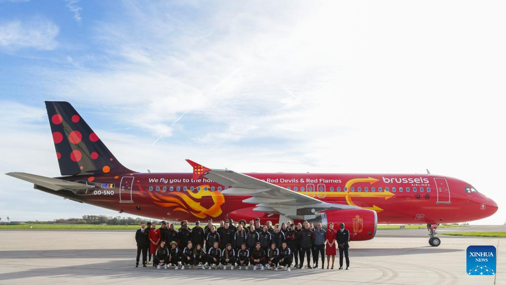 Members of Belgian national men and women football teams and the Brussels Airlines pose for photos with the new Trident airplane at the Brussels Airport in Zaventem, Belgium, Nov. 15, 2022. (Xinhua/Zheng Huansong)