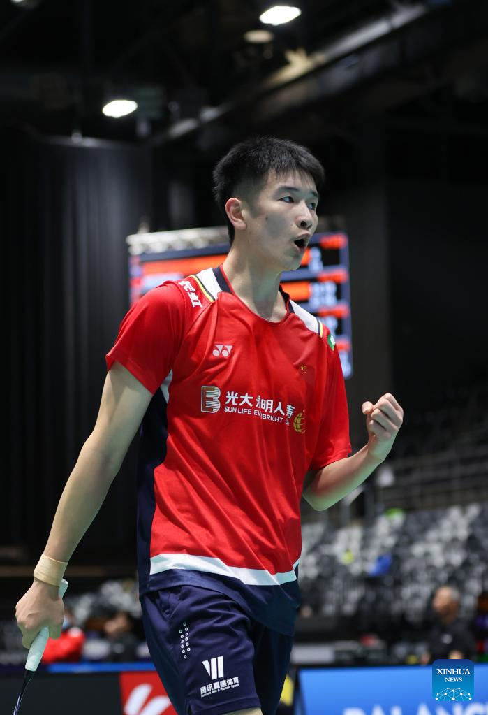 Li Shifeng of China celebrates while competing with Chico Aura Dwi Wardoyo of Indonesia during their men's singles 1st round match at the Australian Open 2022 badminton tournament in Sydney, Australia, Nov. 16, 2022. (Xinhua/Bai Xuefei)