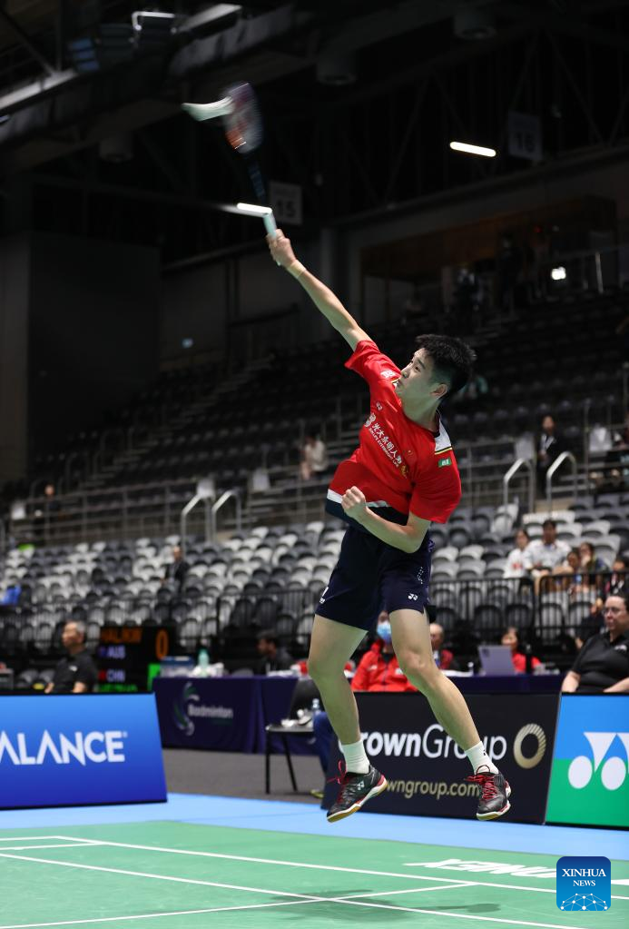 Li Shifeng of China hits a return to Chico Aura Dwi Wardoyo of Indonesia during their men's singles 1st round match at the Australian Open 2022 badminton tournament in Sydney, Australia, Nov. 16, 2022. (Xinhua/Bai Xuefei)