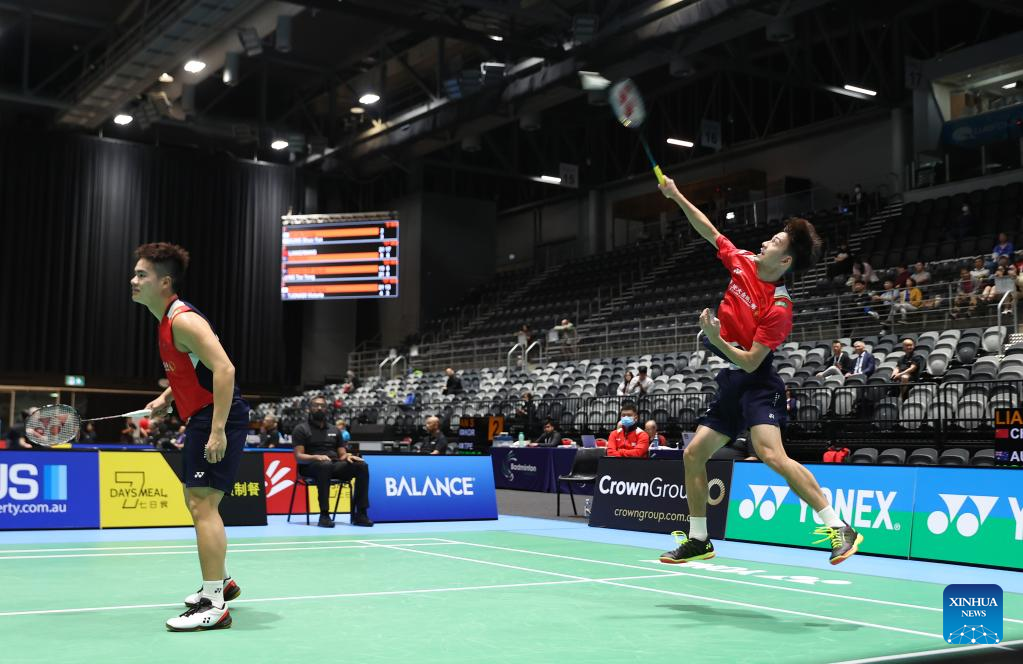 Liang Weikeng/Wang Chang (R) of China compete with Jason Hong/Kevin Xu of Australia during their men's doubles 1st round match at the Australian Open 2022 badminton tournament in Sydney, Australia, Nov. 16, 2022. (Xinhua/Bai Xuefei)