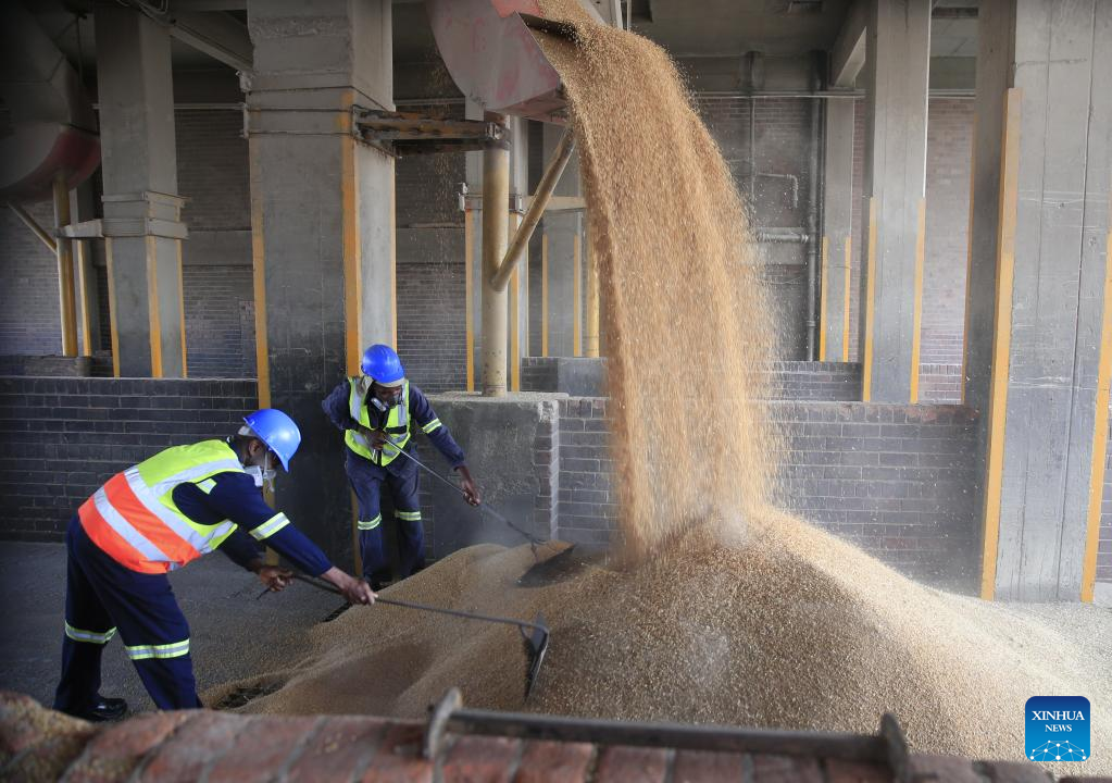 Workers work at Grain Marketing Board's Aspindale depot in Harare, Zimbabwe, Nov. 10, 2022. As many African countries face wheat shortages owing to the disruption of supply chains, this year Zimbabwe is projected to produce 380,000 tonnes of wheat against a national consumption estimate of 360,000 tonnes.(Photo by Shaun Jusa/Xinhua)