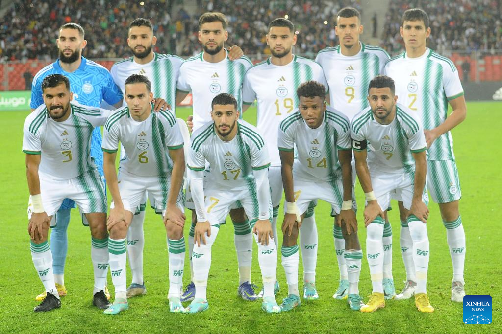Algeria's starters pose for a group photo ahead of the friendly match between Algeria and Mali at Miloud Hadefi Stadium in Oran, Algeria, Nov. 16, 2022. (Xinhua)