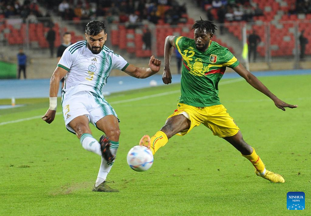 Algeria's Hocine Benayada (L) vies with Mali's Boubacar Traore during the friendly match between Algeria and Mali at Miloud Hadefi Stadium in Oran, Algeria, Nov. 16, 2022. (Xinhua)