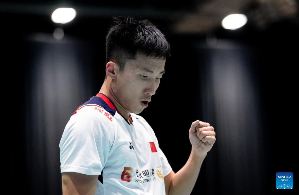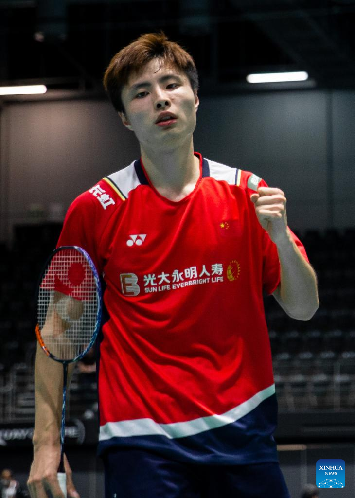 Shi Yuqi of China celebrates during men's singles 2nd round match against his teammate Weng Hongyang at the BWF Australian Open 2022 badminton tournament in Sydney, Australia, Nov. 17, 2022. (Photo by Hu Jingchen/Xinhua)