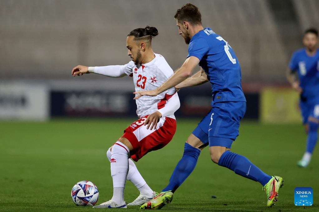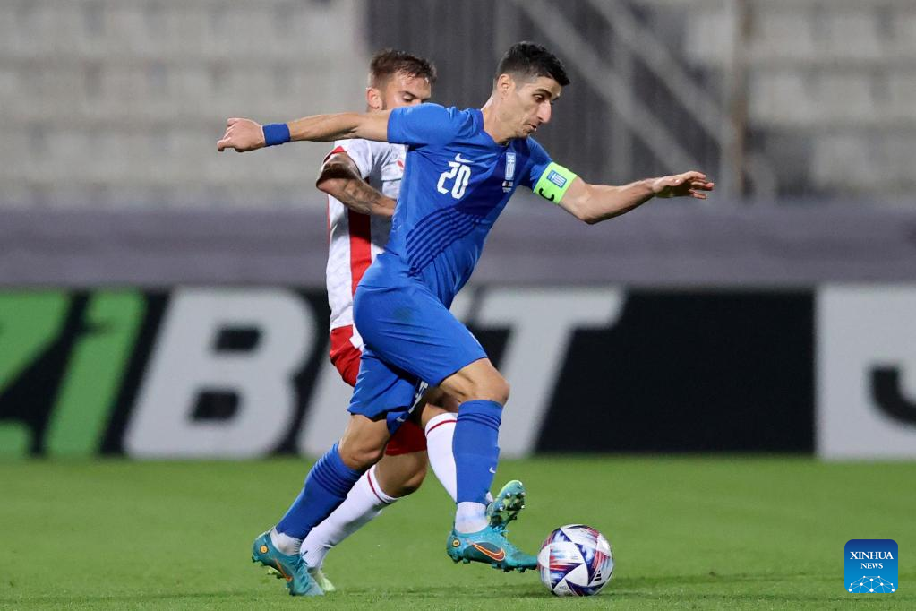 Dimitris Giannoulis (R) of Greece breaks through during an international friendly match between Malta and Greece at the National Stadium, Attard, Malta, Nov. 17, 2022. (Photo by Jonathan Borg/Xinhua)