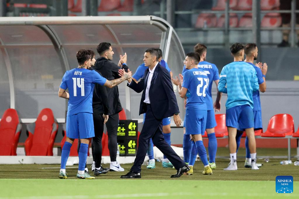 Gustavo Poyet (4th L), head coach of Greece, communicates with Lazaros Rota (1st L) after an international friendly match between Malta and Greece at the National Stadium, Attard, Malta, Nov. 17, 2022. (Photo by Jonathan Borg/Xinhua)